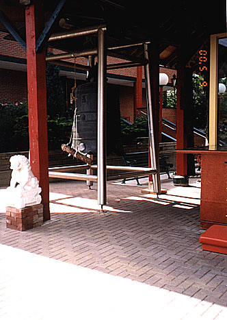 чугунный колокол с буддийскими сутрами на боках висит недалеко от